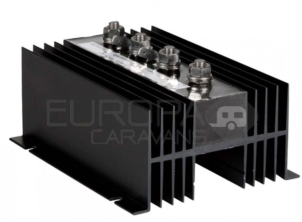 Gescheiden laden Met de laadstroomverdelers uit de DB-serie kunnen accu(groepen) gelijktijdig en geheel gescheiden geladen worden. Op deze manier kunnen meerdere accu’s/groepen geladen worden vanuit de dynamo (en/of acculader) zonder dat de accu’s elkaar beïnvloeden. De laadstroom wordt in de verdeler opgesplitst en verdeeld naar gelang van de vraag per accu(groep). De accu's staan echter niet met elkaar in verbinding en kunnen elkaar dus onderling niet ontladen door verbruikers. Verliesarm Deze laadstroomverdelers zijn verliesarm. Bij bijvoorbeeld een volle 100Ah accu met een ingangsspanning van 13,8Volt is het spanningsverlies slechts 0,005Volt. De DB 180 is geschikt voor 2 accu’s/groepen en de DB 270 voor 3 accu’s/groepen. Beide laadstroomverdelers zijn geschikt voor 12 en 24 volt systemen. De maximale ingangsspanning bedraagt 32Volt. De accu’s mogen verschillend in capaciteit zijn. De maximale (laad)stroom mag 90 Ampère bedragen. Om een hogere stroom te bereiken kunnen twee laadstroomverdelers van het zelfde type parallel geschakeld worden. De maximale laadstroom wordt hierdoor verdubbeld tot 180 Ampère.