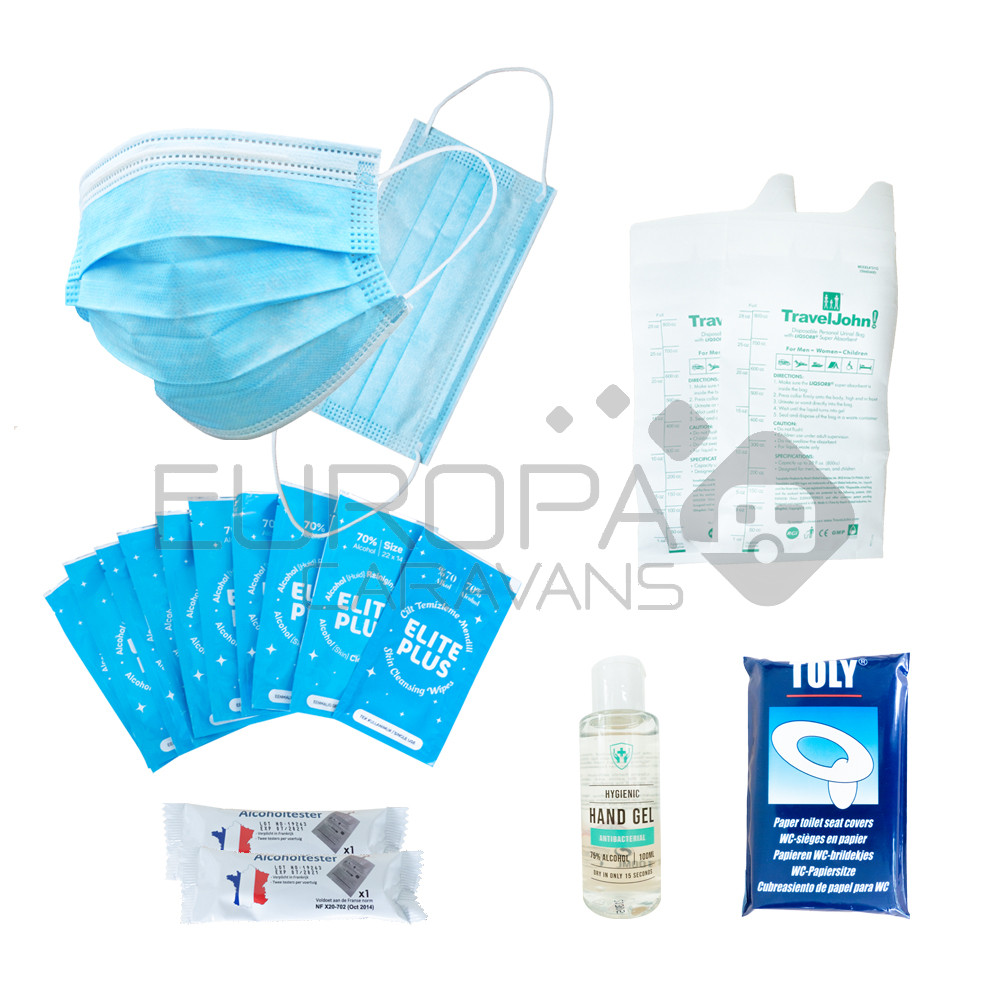 Ons "Wijs op Reis Hygiëne Pakket" bestaat uit: 10 - WC Brildekjes 10 - Alcohol Reinigingsdoekjes 2 - Alcoholtesters 2 - Mondkapjes 2 - Plaszakjes 1 - Hygiënische Handgel 100ml