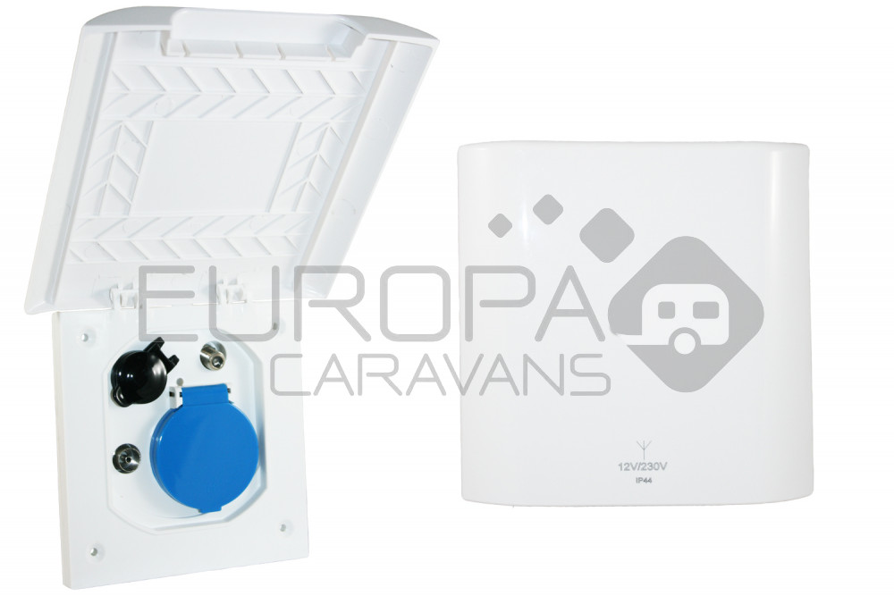 Vierkant witte Stekkerdoos voorzien van 12V aansluiting, F connectoren,sat en 230V stekker. De doos dekt de gaten van een ander merk doos af cq zijn dezelfde maten. Afm 148x 148mm