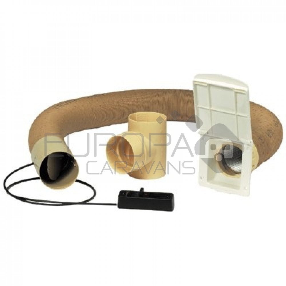 Om de warme lucht van de reeds aanwezige kachel in de voortent te blazen. Set bestaat uit: buitenklep, 1meter buis 65mm, T-stuk en regelklep.