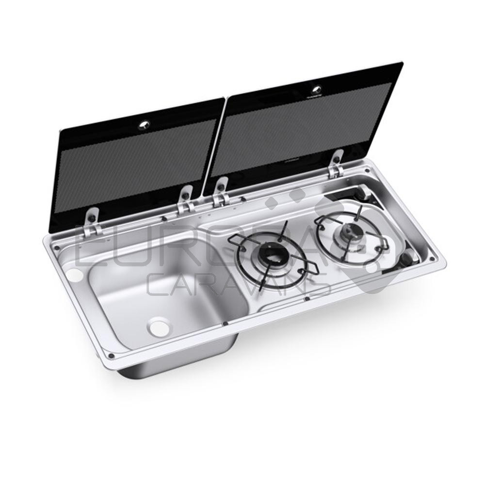 Deze compacte combinatie van een 2-pits gaskookplaat en spoelbak biedt ook in de kleinste ruimtes handige keukenfaciliteiten.De glasplaten bestaan uit 2 delen zodat je ze afzonderlijk kan openen, echter ook zorgt het ervoor als beide gesloten zijn dat je extra werkruimte hebt. De spoel- kook combinatie wordt geleverd met sifon en rubber afdichting. De kraan moet apart besteld worden.