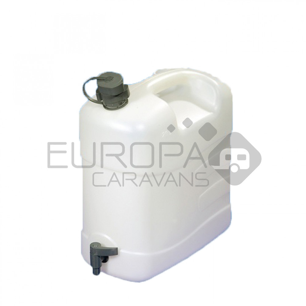 Jerrycan met kraan en vultuit. Jerrycan is voor zien van handgreep. Schenktuit is geïntegreerd in de schroefdop. Met ontluchting in de tuit. Geschikt voor drinkwater en vloeibare levensmiddelen.