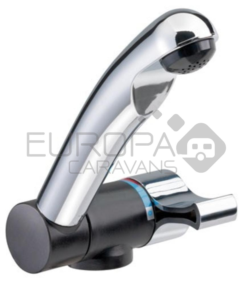 Mengkraan met draai- en zwenkbare uitloop en microschakelaar. Langere uitloop dan type 2002. Kunststof uitvoering. 12volt. Voorzien van keramisch binnenwerk. Voor slangaansluiting 10mm. Doorvoergat 20mm (koud) 27mm (meng). Inbouw hoogte 38mm. Geschikt tot 3bar.