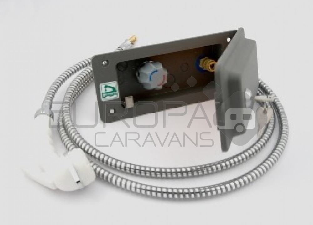 Inbouwdoos voorzien van voormenger inclusief doucheslang en douchekop Charisma. Deksel hoogte 28 mm. Deksel is tevens afsluitbaar door slot. Achterzijde is voorzien van een slangaansluiting 8-10 mm.