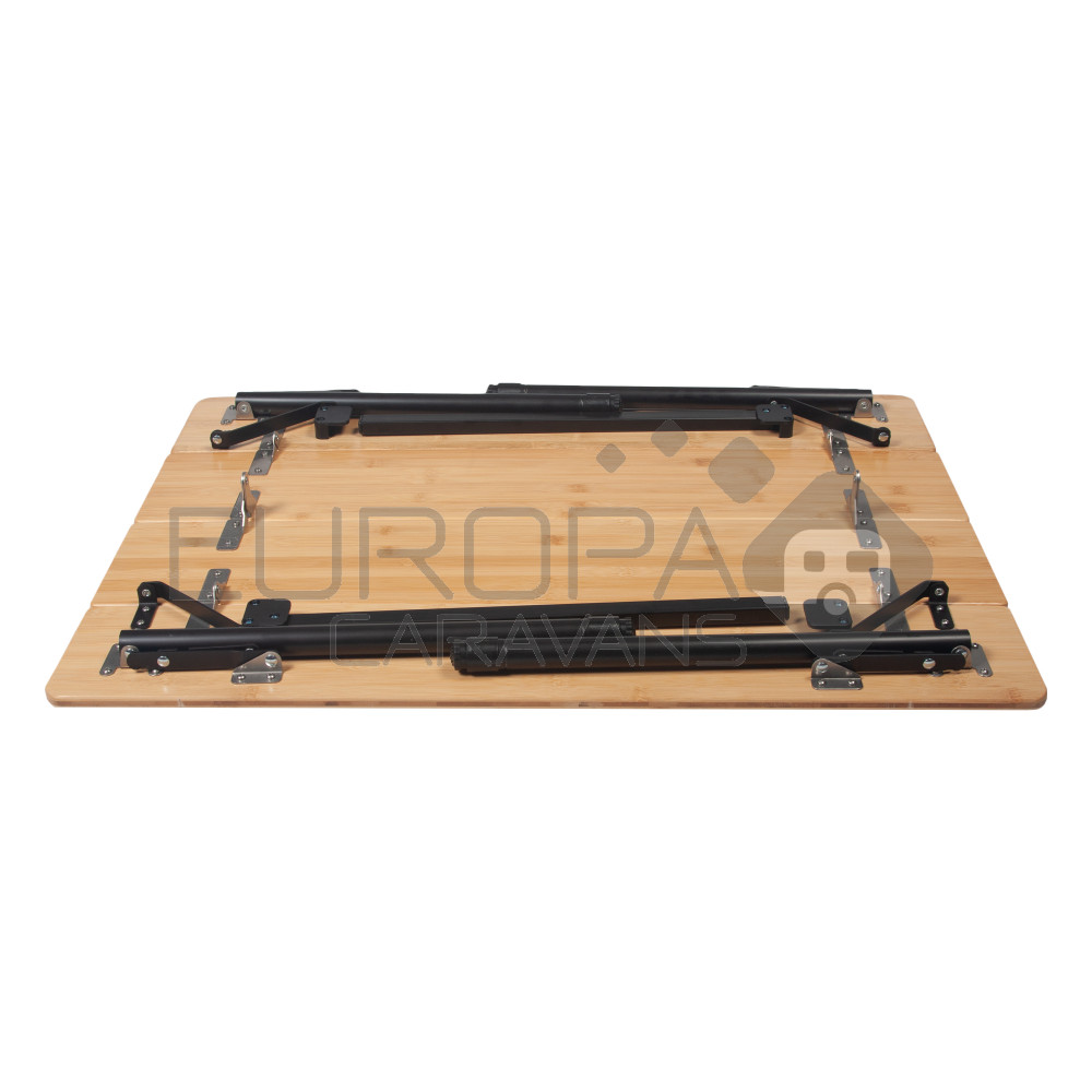 Deze licht gewicht campingtafel is ideaal doordat je het blad in 4 delen kan opvouwen, dat maakt het pakvolume gelijk een stuk aantrekkelijker. De ViaMondo Boa is verkrijgbaar in 2 of 4 persoons uitvoering. De poten zijn traploos verstelbaar zodat je bij ongelijke ondergrond de tafel stabiel kunt plaatsen. Het tafelblad is gemaakt van bamboe en het onderstel van aluminium.