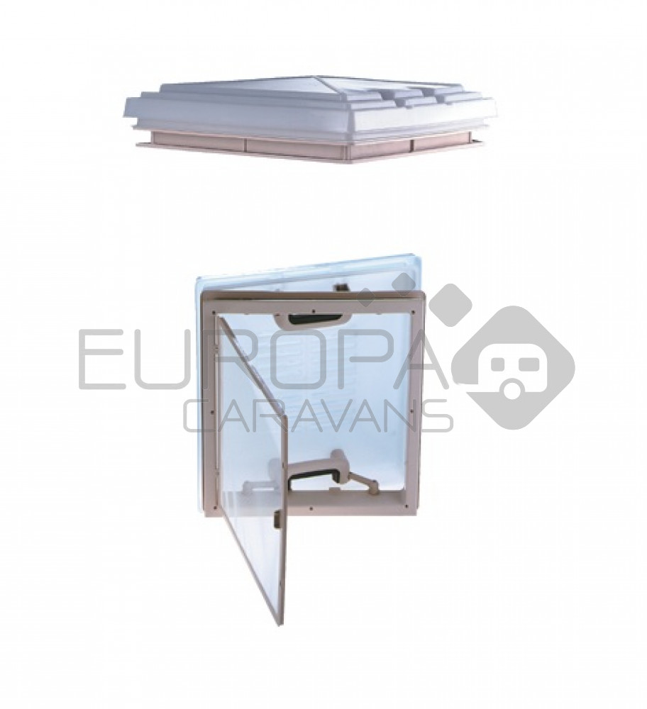 Dakluik met een melkglas kap. Door de telescopische handgrepen is het dakluik te openen naar vier zijden. Het dakluik wordt geleverd zonder vliegenhor en/of verduistering. Deze zijn optioneel te bestellen.