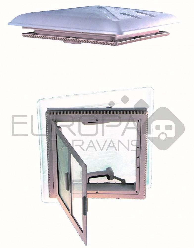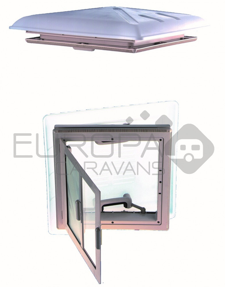 Dakluik van 40x40cm met wit binnenkader en extra grote kap om spatwater in de caravan te voorkomen. Door de telescopische handgrepen is het dakluik te openen naar vier zijden. Het dakluik is voorzien van een combirollo en is leverbaar met een transparant of melkglas kap.