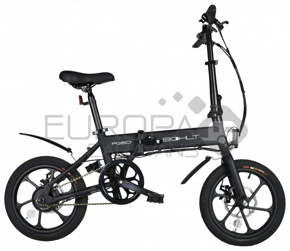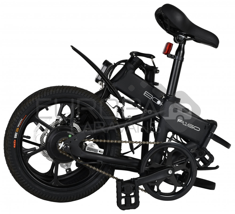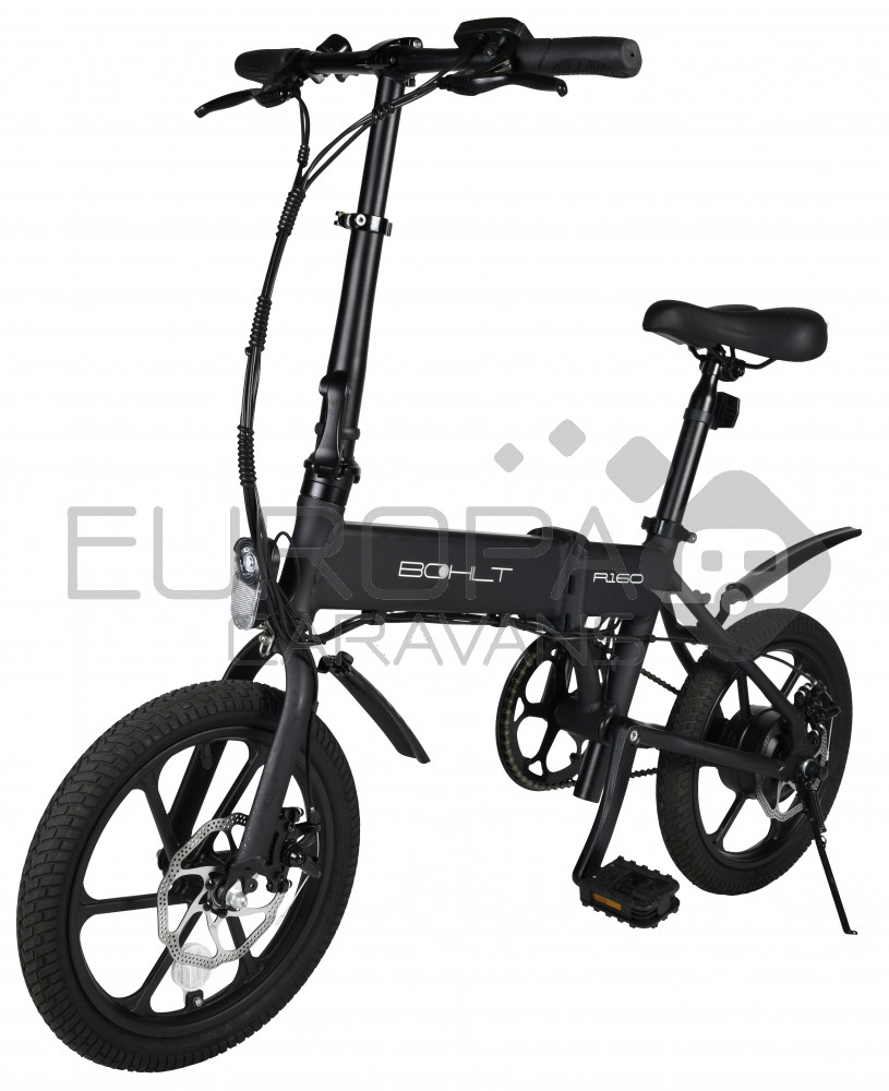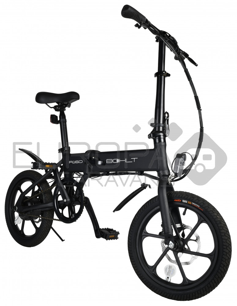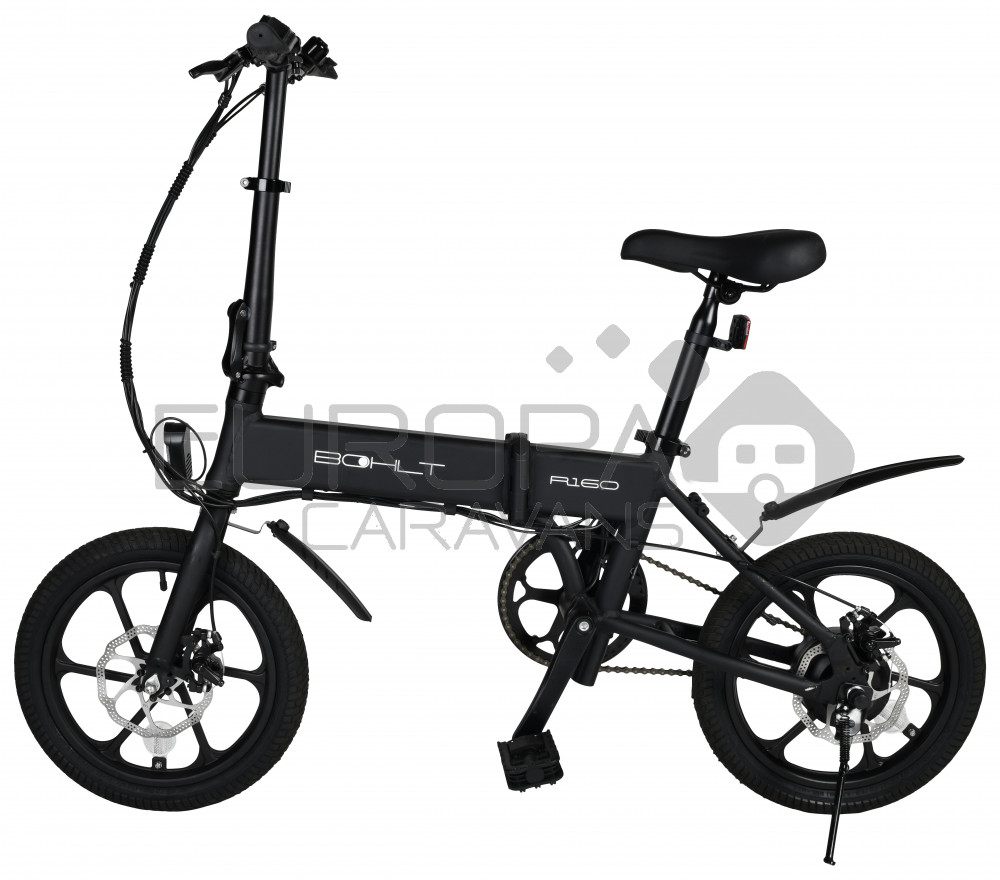 De Bohlt R160 is een compacte elektrische vouwfiets met 16 inch wielen die u snel en gemakkelijk opvouwt. Deze vouwfiets is ideaal om uw laatste kilometers te overbruggen van huis naar werk. Met het gewicht van 17,5kg inclusief accu, tilt u hem gemakkelijk de trein of bus in. Ook kan u deze vouwfiets gemakkelijk plaatsen in uw kofferbak. Deze vouwfiets heeft een maximale snelheid van 25km/u en een actieradius van 40km (stand 1). Heeft een 3 speeds trapondersteuning, met schijfremmen voor en achter. De accu is in 4 uur opgeladen.
