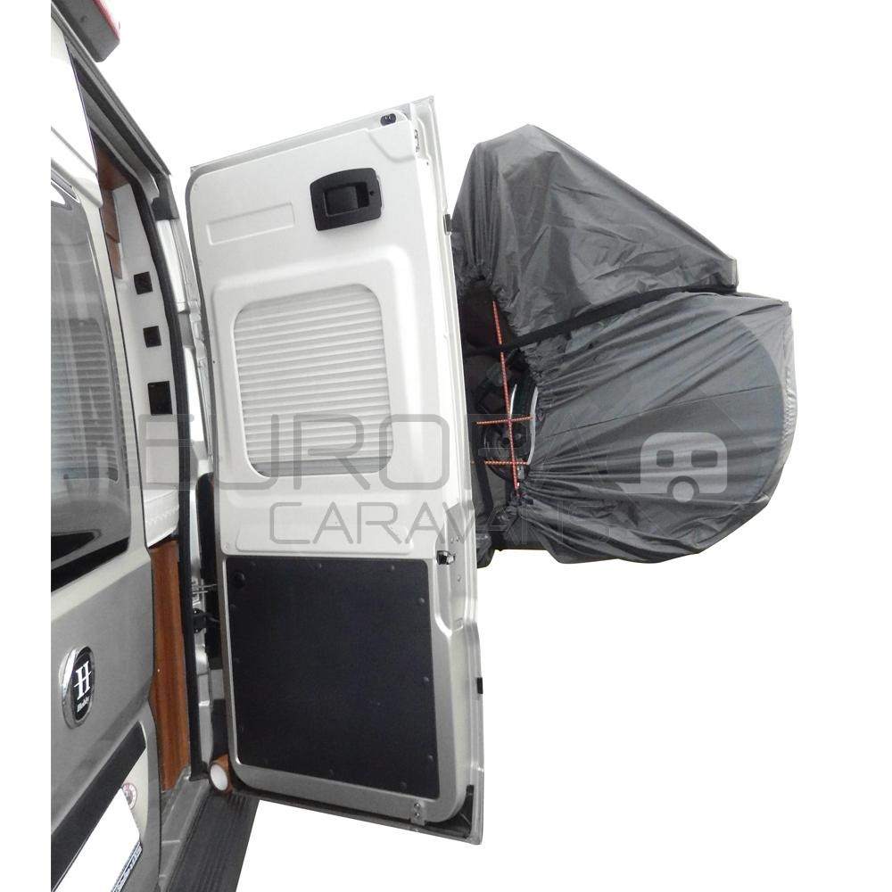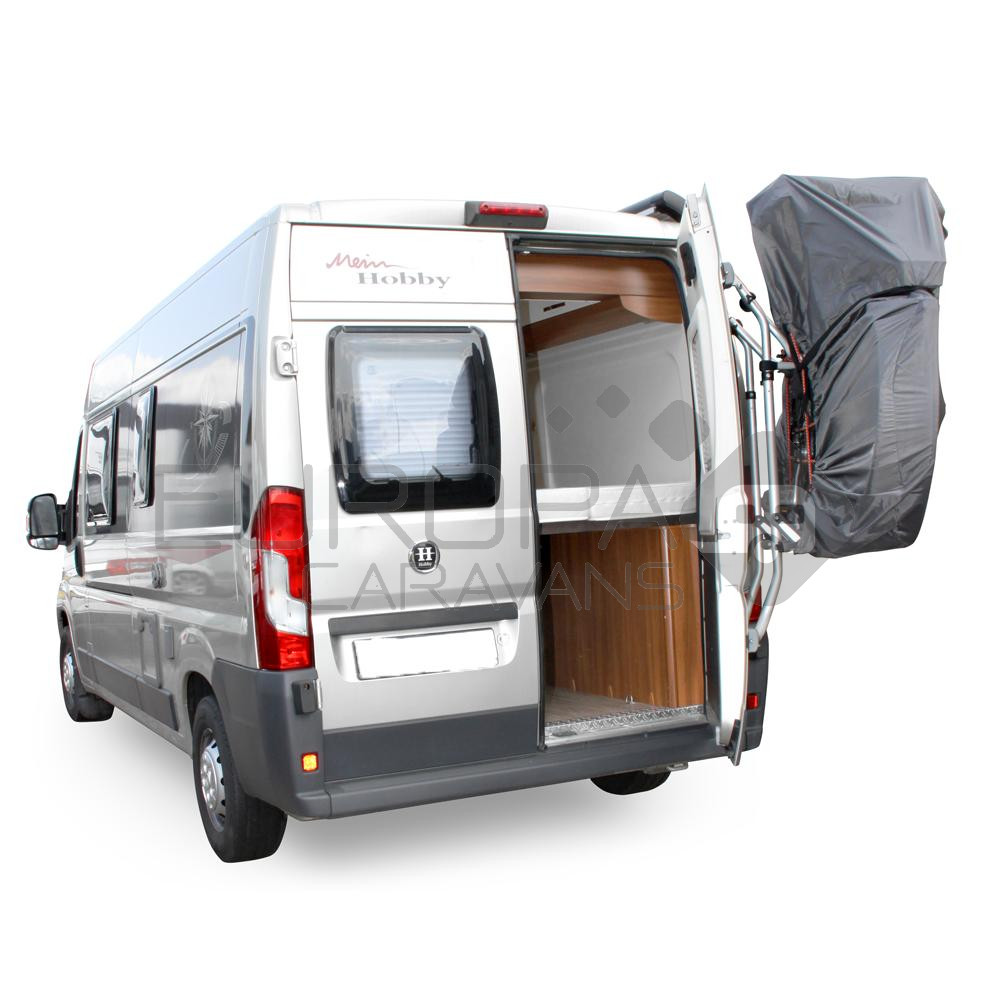 - Fietshoes voor de achterwand van een VAN. - De hoes is gemaakt van hoogwaardig polyester. - Eenvoudige montage door de bijgeleverde spanners. - Geschikt voor een fietsendrager met 1/3 fietsen. - Met een geïntegreerd transparant venster voor een gevarenplaat.