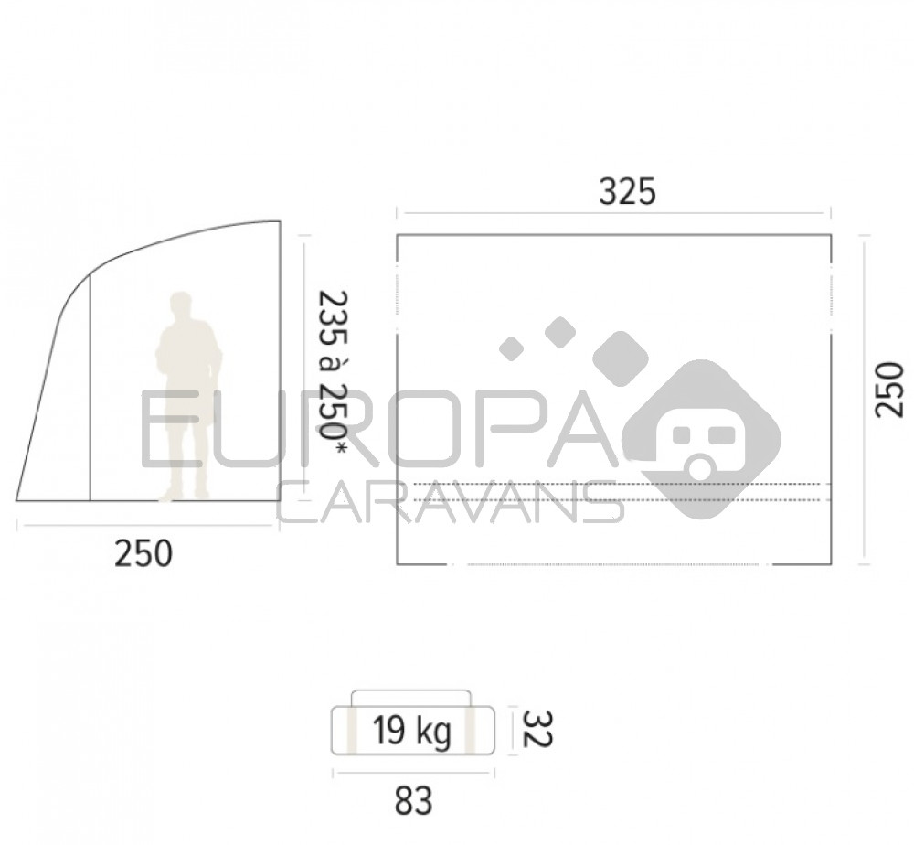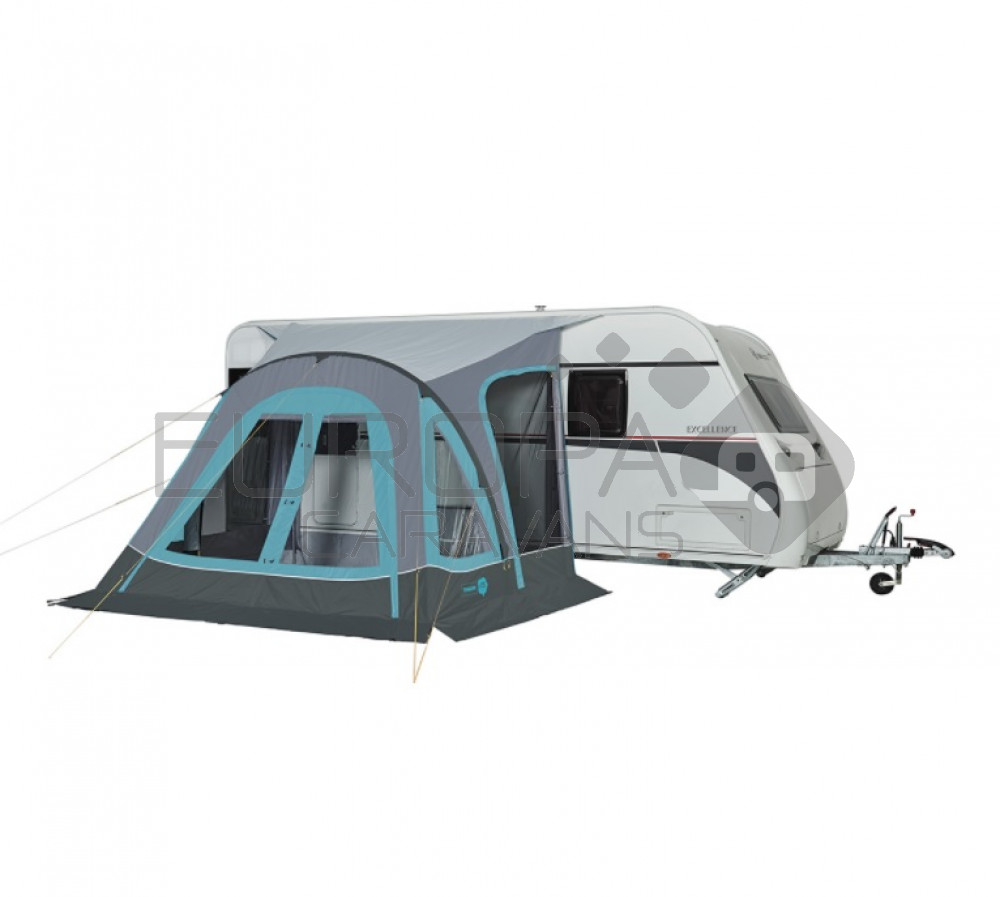 Profiteer van de Air Camp technologie, een TRIGANO-innovatie, die de installatie vereenvoudigt en het volume aanzienlijk vermindert. Deze opblaasbare voortent is zeer eenvoudig op te zetten. Het front is afneembaar en kan worden opgerold om het oppervlak van de leefruimte te vergroten. De twee zijdeuren met horren geven een zeer praktische kant aan deze 2,50 meter diepe voortent. Om de privacy te waarborgen zijn voor de ramen verduisterende binnenluiken aangebracht. Met de optie Blind Kit kan de voortent worden aangepast aan de jaloezieën van bepaalde campers en bestelwagens. De voortent is geschikt voor een voertuighoogte van 235cm tot en met 250cm.