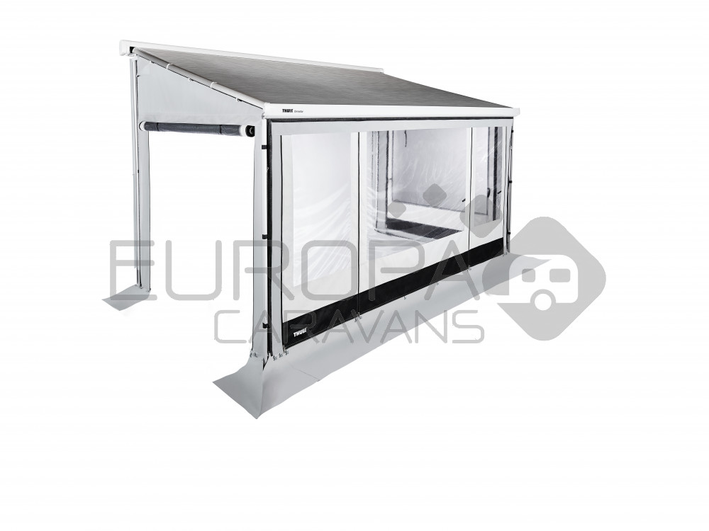 De Thule Residence G3 is een makkelijk te bevestigen luifeltent waarvan de voorwand, de zijwanden en de gordijnen apart besteld dienen te worden. De voorwand schuift in de voorlijst van de luifel. Klemprofielen verbinden de zijwanden met het luifeldoek en zorgen voor een perfecte aansluiting tussen wand en dak. Dubbele C-profielen zorgen voor een winddichte afsluiting tussen voorwand en zijwand. De zijwanden zijn voorzien van een raam met vliegengaas die geopend kunnen worden. Tevens kunnen de zijwanden en voorwand omhoog gerold worden voor gemakkelijke toegang. Voorwanden van 3.00 en 3.25 lengte hebben een deuropening aan de rechterzijde, voorwanden vanaf 3.50 lengte hebben een deuropening aan beide zijden.