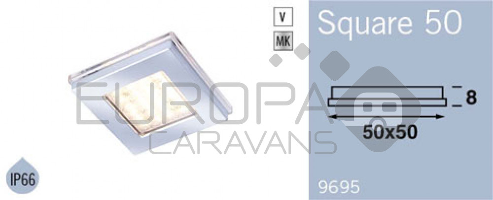 Opbouwspot Square 50 is voorzien van 4 LED's. 0,8Watt, 16 Lumen, 12Volt. Voetplaat vierkant 50x50mm. Hoogte 8mm.